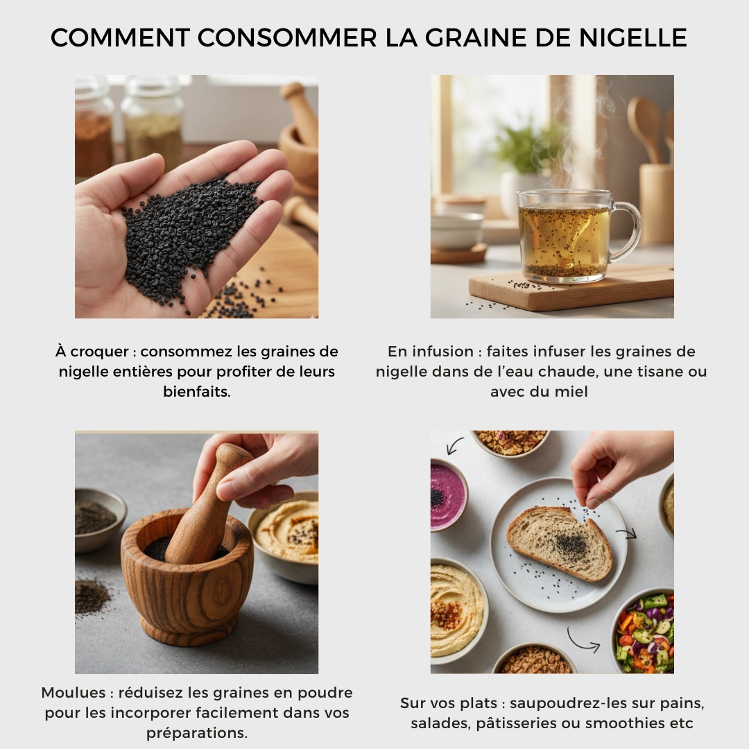 💡 Astuce : Vous pouvez aussi mélanger les graines moulues avec du miel pour une cure naturelle, ou les incorporer dans des smoothies ou boissons chaudes.