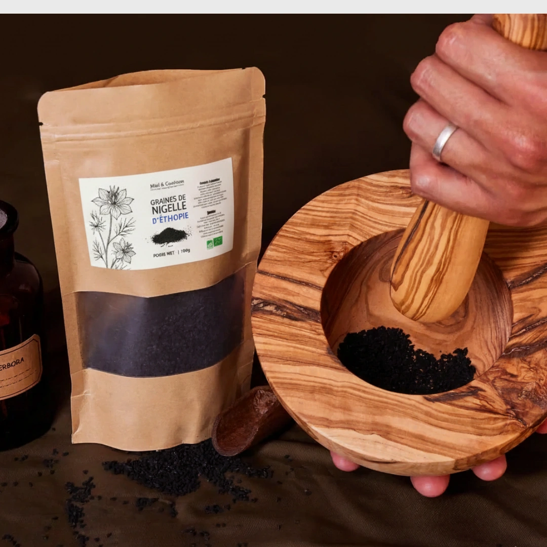 Mentionnées dans la médecine prophétique comme un remède précieux, les graines de nigelle occupent une place centrale dans les traditions orientales et islamiques. Le Prophète Mohammed ﷺ a rapporté qu’elles constituent une guérison pour toute maladie sauf la mort, soulignant leur importance dans l’hygiène de vie naturelle