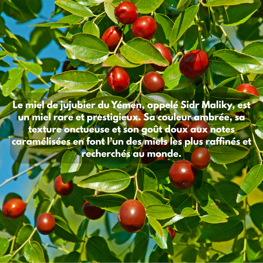Le miel de jujubier royal (sidr maliky) est issu du jujubier, un arbre sauvage qui pousse au Yémen dans la région de Daw’an (Hadramawt) et reconnu depuis des millénaires pour ses vertus médicinales. Cet arbre pousse sur des terres sauvages et non cultivées, typiques des régions désertiques du Yémen. La dénomination “royal” de ce miel provient de sa qualité, car il existe plusieurs types de qualité pour ce miel.