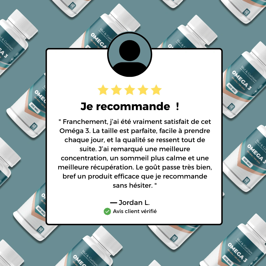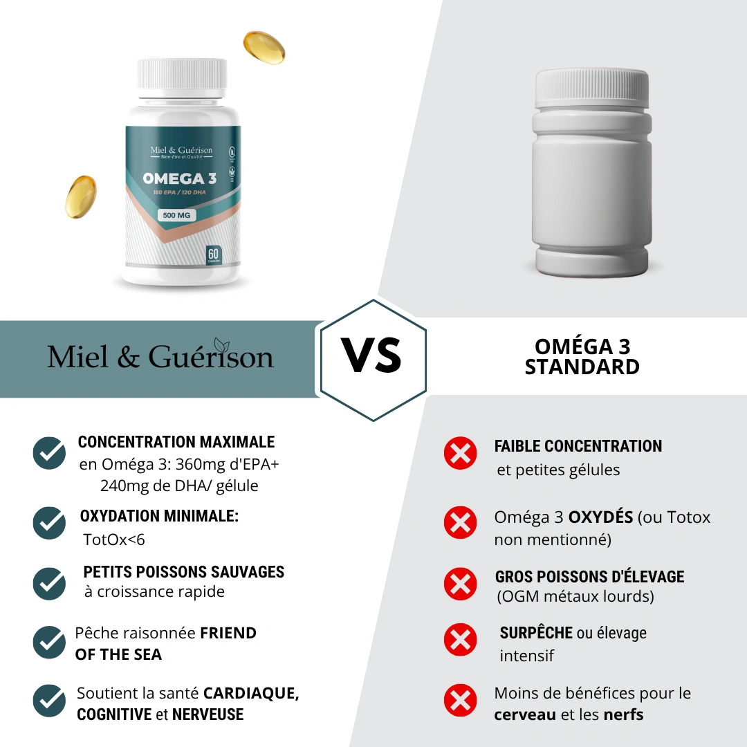 Notre Oméga 3 Premium est formulé à partir d’huiles de poissons sauvages Miel&Guérison®, une référence mondiale pour sa pureté, sa stabilité et sa concentration exceptionnelle en EPA et DHA. Ces acides gras essentiels, naturellement présents sous forme de triglycérides, garantissent une biodisponibilité optimale et une assimilation maximale par l’organisme.