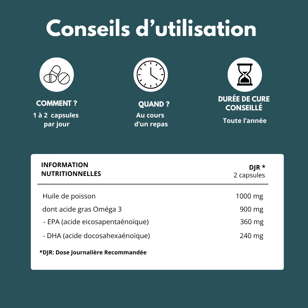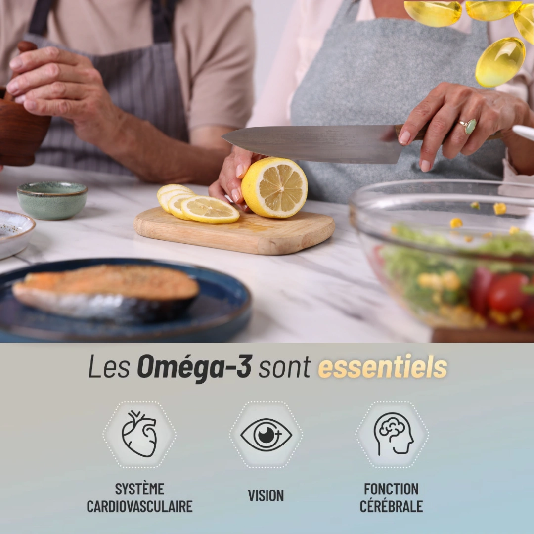 Associez votre cure d’Oméga 3 à une alimentation équilibrée et riche en antioxydants (fruits, légumes, noix) pour renforcer les effets protecteurs sur le cœur, le cerveau et la peau.