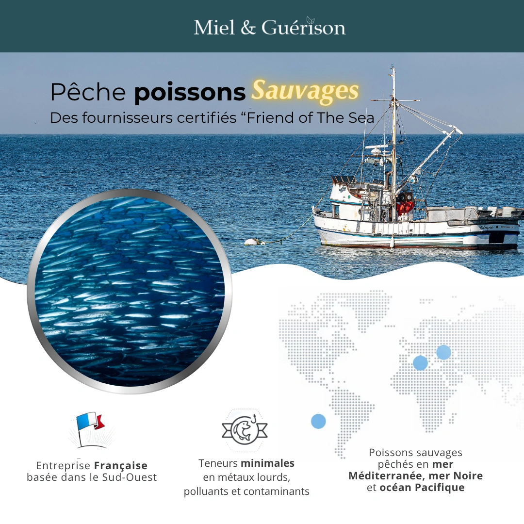 tart= »1251″ data-end= »1505″>L’huile Miel&Guérison® est issue de poissons pêchés de manière durable et responsable, certifiée Friend of the Sea®, et purifiée pour garantir un indice TOTOX < 7, l’un des plus faibles du marché, gage d’une fraîcheur et d’une qualité incomparables.