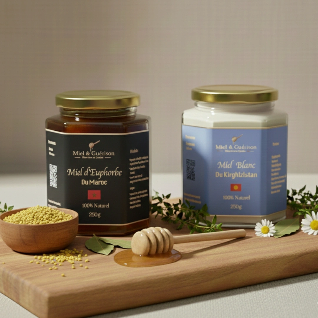 Miel Blanc Du Kirghizistan, Miel D'Euphorbe Du Maroc, Miel de Cèdre de Turquie, Miel De Fleurs De Nigelle D’Égypte, Miel de Fleurs et Graines de Nigelle, Miel De Jujubier Du Pakistan, Miel de Thym De Nouvelle Zélande