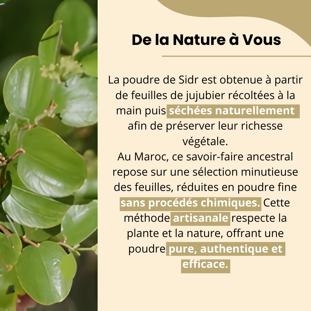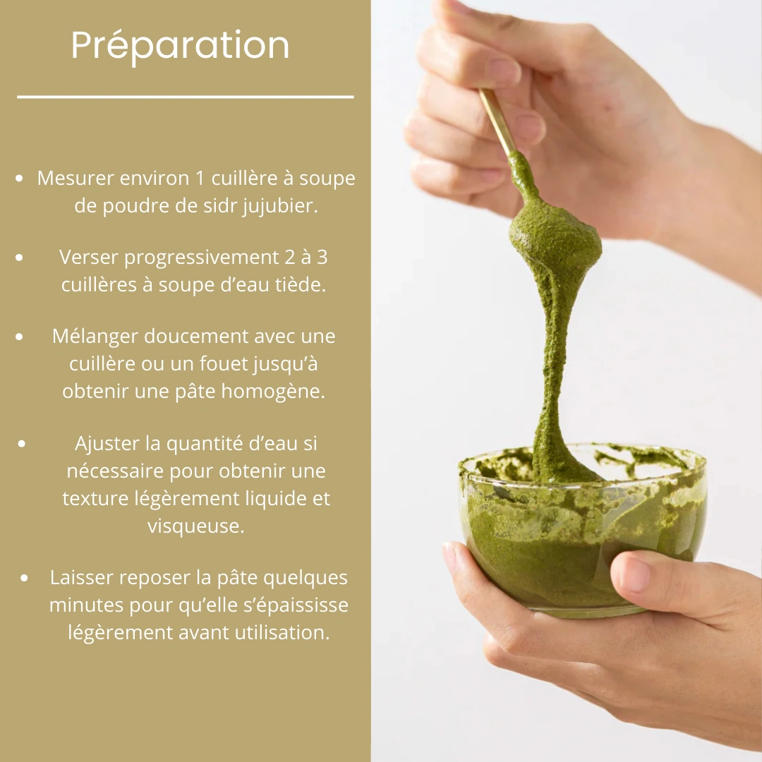 La poudre de Sidr est idéale pour une routine beauté naturelle et respectueuse de vos cheveux et de votre peau, selon les traditions ayurvédiques et orientales.