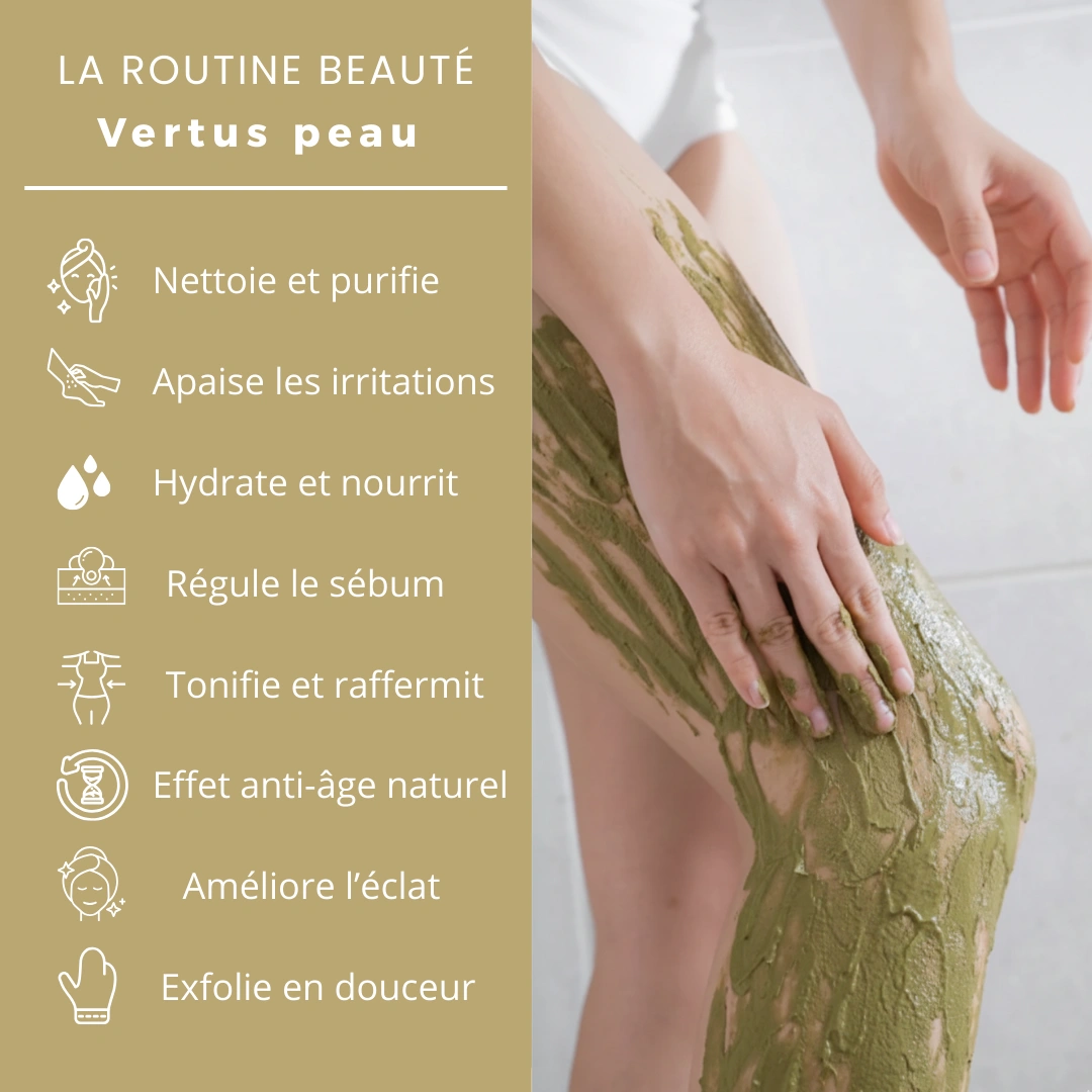 Soin et éclat de la peau : nettoie, purifie, absorbe les impuretés et illumine le teint.